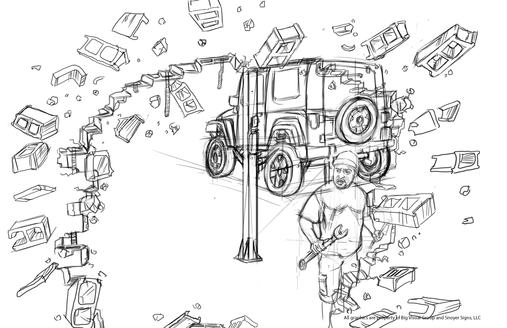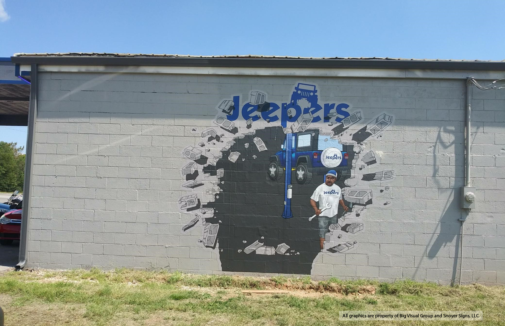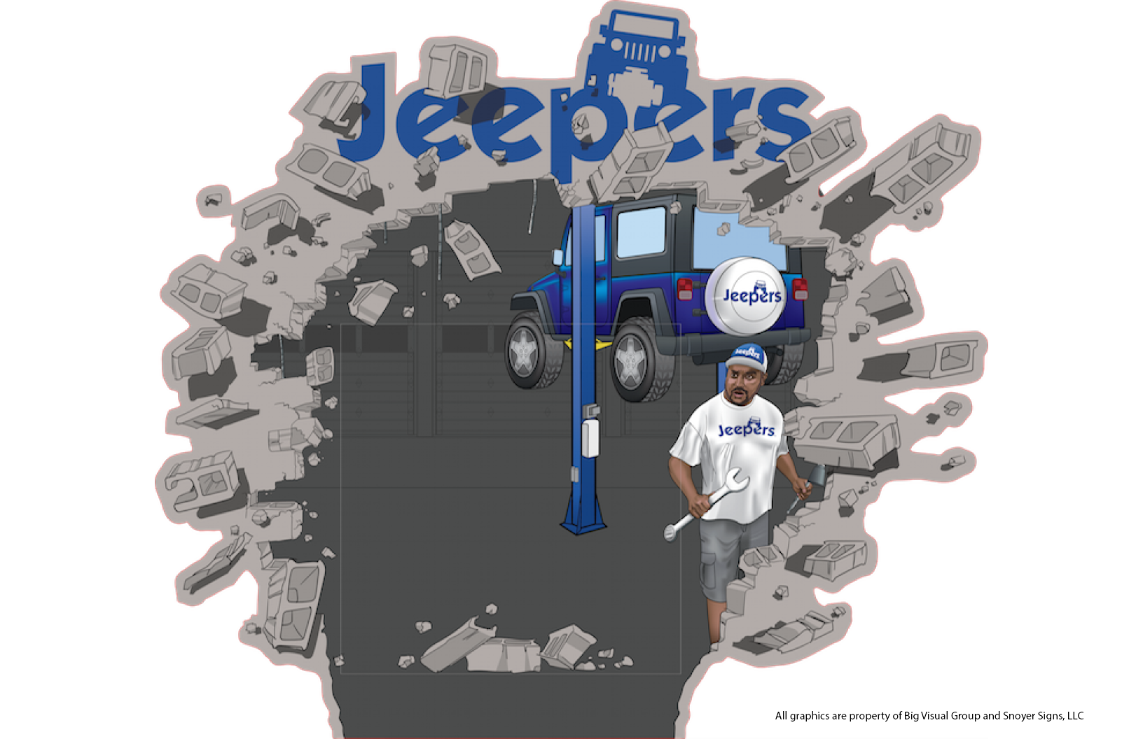 The client, Jeepers, was renovating a auto mechanic garage and wanted a photo-op wall accent. It would look like a jeep (to be added later) has crashed through the wall with a co-owners reaction.